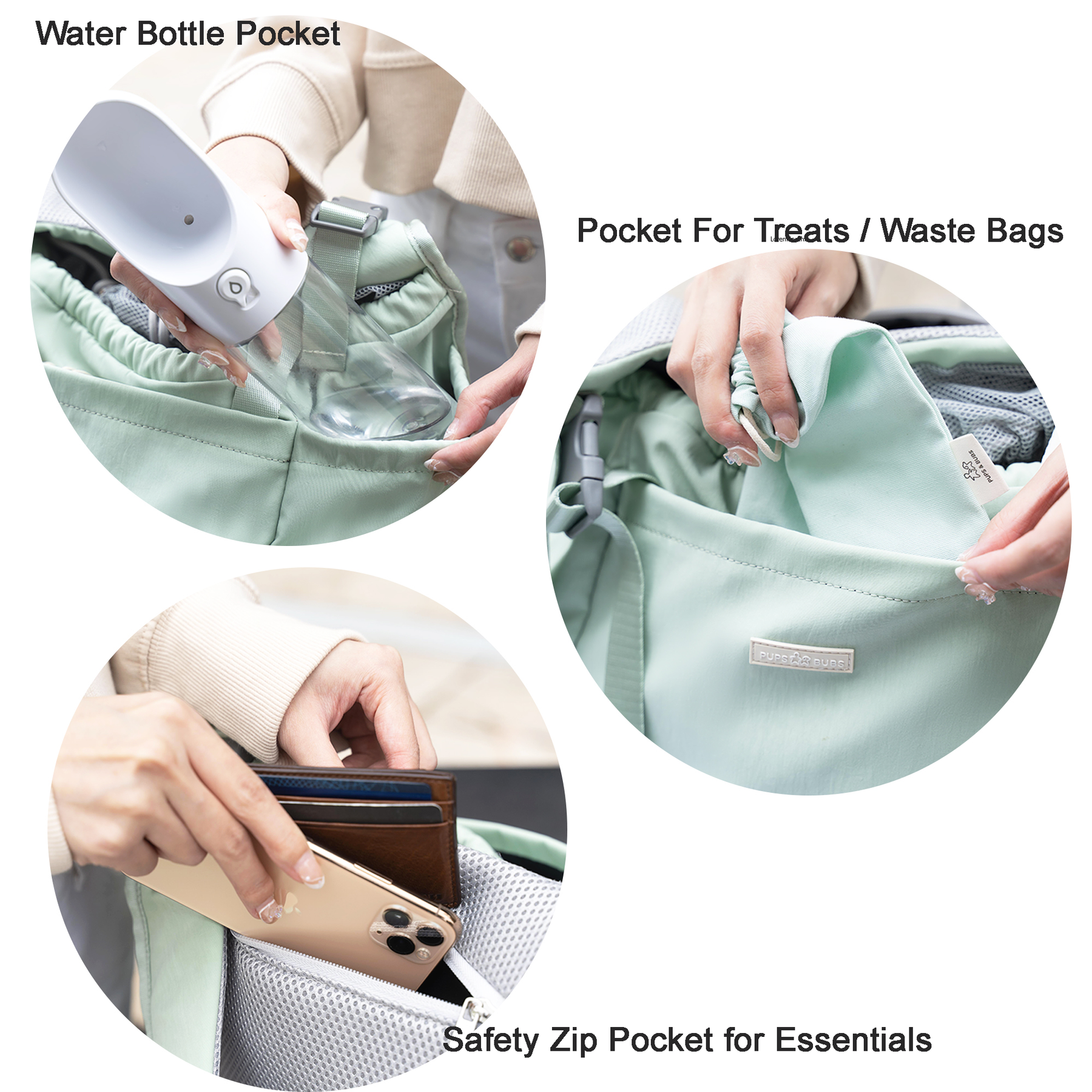 ✦ Viele Taschen für alles Zubehör – so müssen Sie keine zweite Tasche mehr tragen! Sicherer Reißverschlussfach im Rückenbereich für einfachen Zugriff auf Telefon, Geldbörse und Schlüssel. 3 Einschubfächer: je eine elastische Seitentasche für Trinkflaschen, großes Vorderfach für Kotbeutel, Snacks oder andere Dinge.